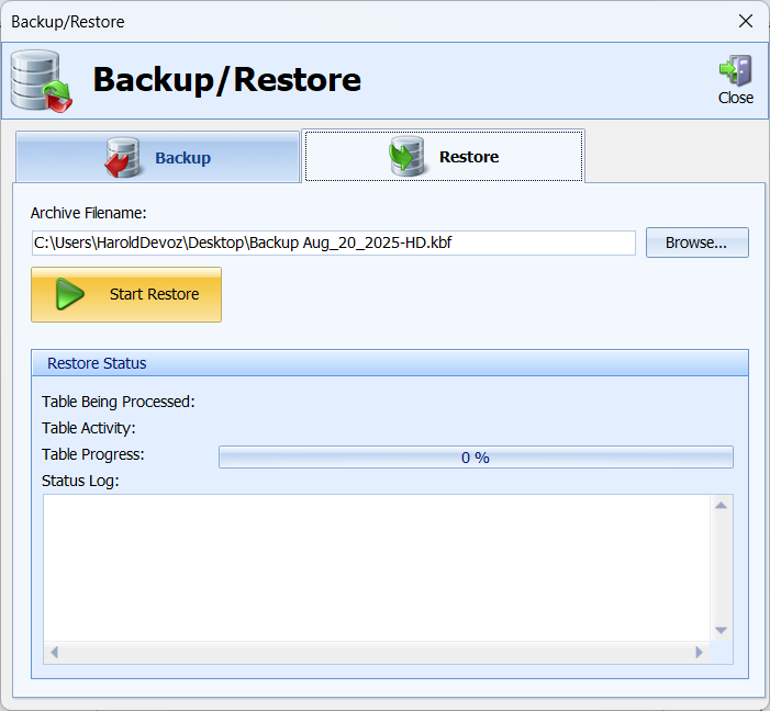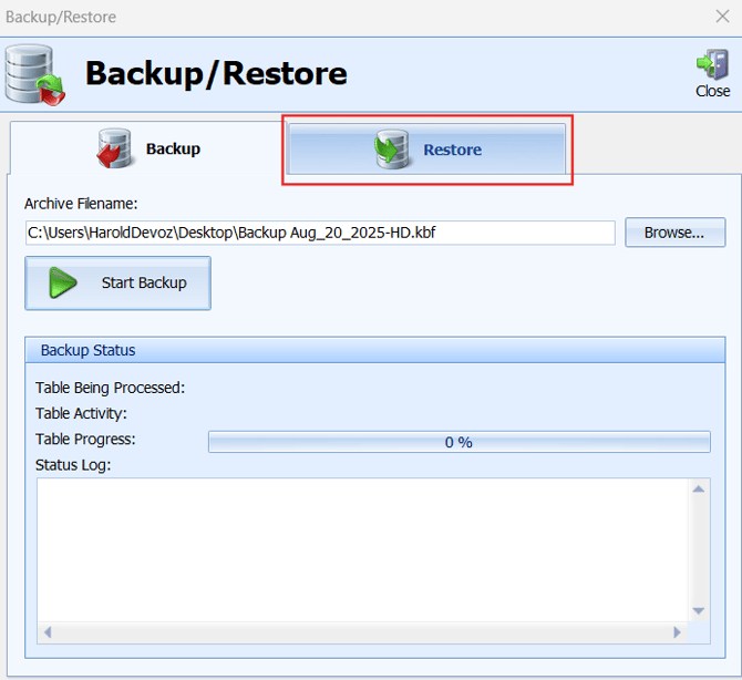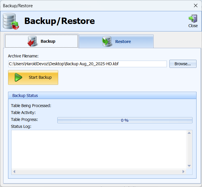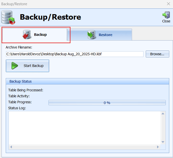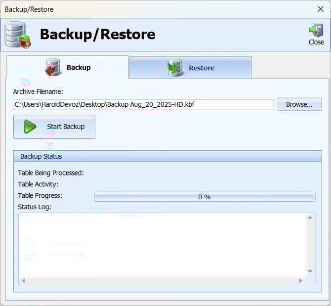 Backup_Aug2025_PreUpdate) It is recommended that a local copy as well as an external copy on either an external drive, company network drive, or cloud folder is kept. - Select the Start Backup Button