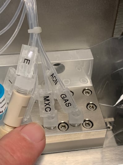 Loosen the fittings on the main block, and fully remove the column inserts. Tape can be used to hold the lines in place after detaching.