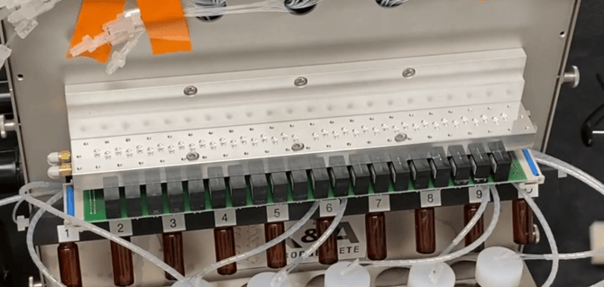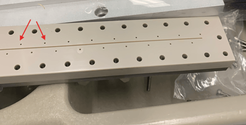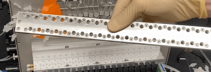Remove the PEEK channel block and clean with ACN and a lint-free wipe.