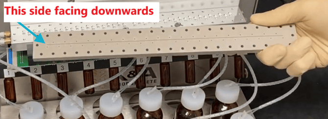Place the membrane beneath the PEEK channel block and the valve block—make sure the channels on the Peek Manifold face downwards. The channels should face the membrane.