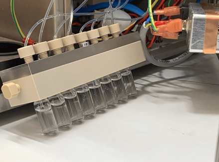 You’re checking for symmetry in rinse volume—if one vial looks dry or barely rinsed, it may point to a clogged line or faulty valve.