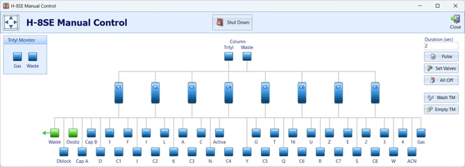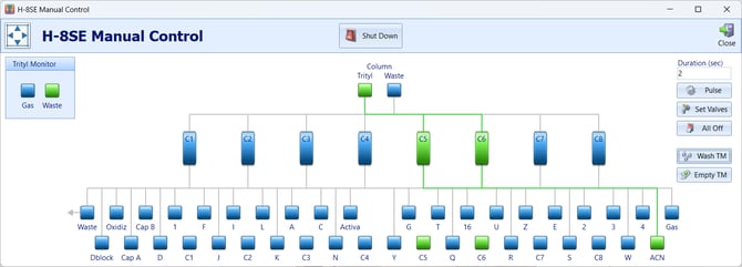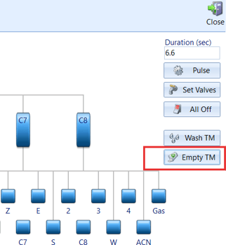 Fully prime each reagent line using your system’s software to ensure the reagent reaches the manifold if it the liquid lines are not currently filled with reagent. This can be done via the Manual Control Screen. A 1-2 Second pulse is usually sufficient.