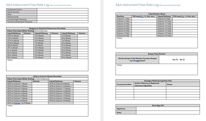 A Sample Log Template can be downloaded here : Instrument Flow Rate Log