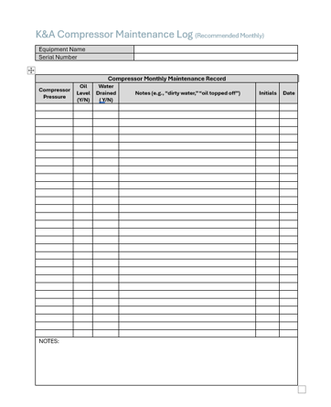 A template Monthly Compressor Maintenance Log can be downloaded here