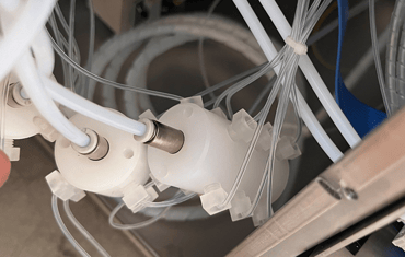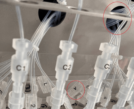 - Remove the liquid fitting for the current bottle cap from the main liquid delivery manifold. The labels can be used to help identify which cap will be removed. Using the small wrench will assist in the fitting removal.
