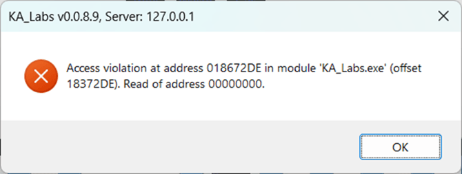 These errors can occur when the K&A software temporarily loses communication with its local database service (NexusDB). Although the server is listed as 127.0.0.1 (localhost), the application relies on a background database process that can be interrupted by system sleep, high CPU usage, antivirus activity, or other Windows processes. This is a software communication issue and does not indicate a hardware fault. The issue is typically resolved by restarting the software or the computer. If the problem persists, ensure the Ethernet cable is connected to the correct port, that the cable is functioning properly and that the computer did not attempt to enter a sleep or hibernate state. To be safe, ensure your system is set to never go to sleep and that windows updates are schedule for time periods when the instrument is not being used. |