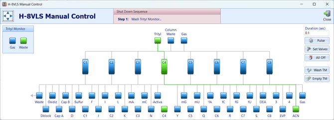 The software activates the gas valve and each reagent/amidite valve one at a time