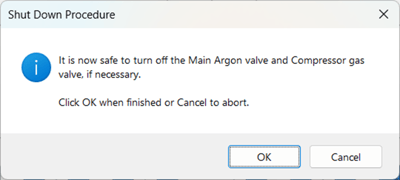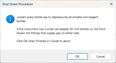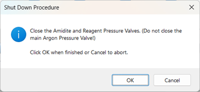 3. Prompts the user to close reagent and amidite pressure valves while leaving the Main Argon Valve ON